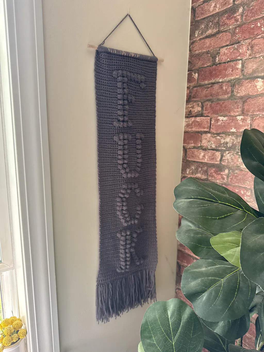 Crocheted with durable acrylic yarn and mounted on a natural wooden dowel, it’s ready to hang and ready to drop jaws.
